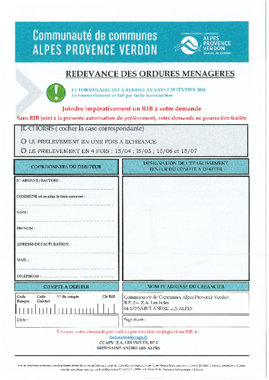 Vous avez jusqu'au 28 février pour remplir et transmettre votre demande de prélèvement en une fois ou 4 fois pour le règlement de votre redevance d'ordures ménagères. Le formulaire peut être retiré au format papier en mairie.
